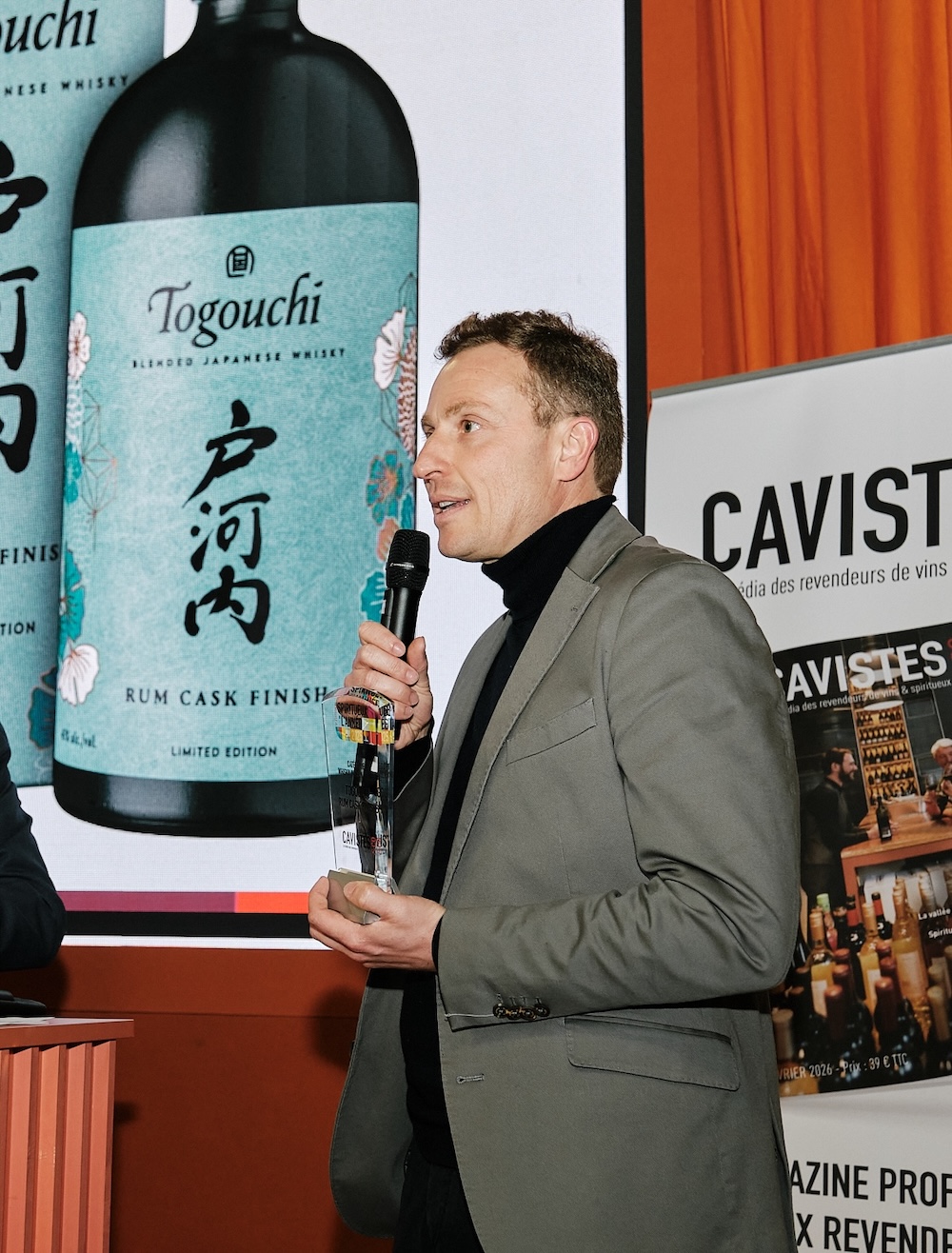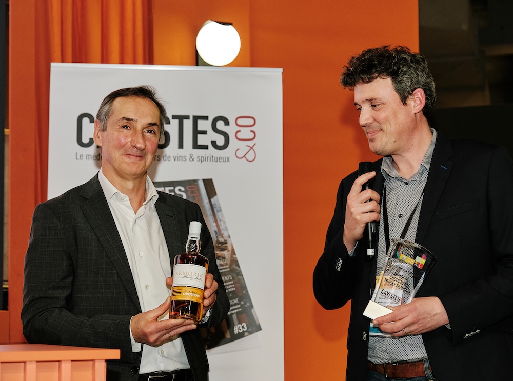 Christophe Sauvaud remet le trophée du Spiritueux français à David Roussier pour le whisky Armorik Chouchen